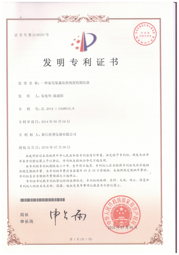 浙江托普云農科技股份有限公司(股票代碼:833692)申請的“一種家用果蔬農藥殘留檢測儀器”發明專利申請,已于2016年7月6日獲得中華人民共和國國家產權局頒發的發明專利證書。