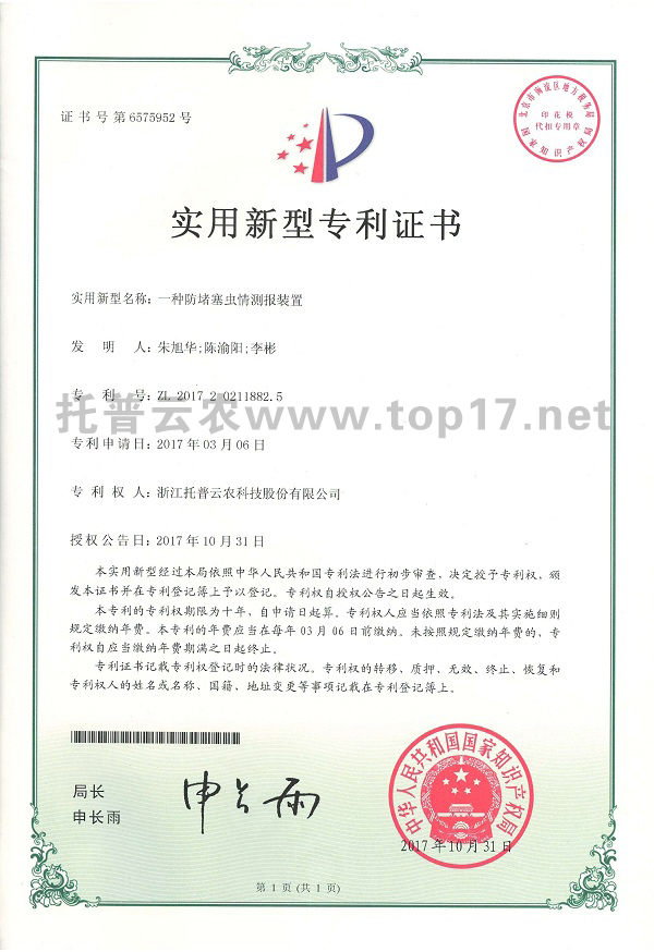 繼智能識別蟲情測報燈控制軟件獲得國家版權(quán)局軟件著作權(quán)后,托普云農(nóng)在蟲情測報領(lǐng)域再取得新突破。10月31日,由托普云農(nóng)研發(fā)的“一種防堵塞蟲情測報裝置”,獲得國家知識產(chǎn)權(quán)局實用新型專利授權(quán),授權(quán)專利號:ZL 2017 2 0211882.5。