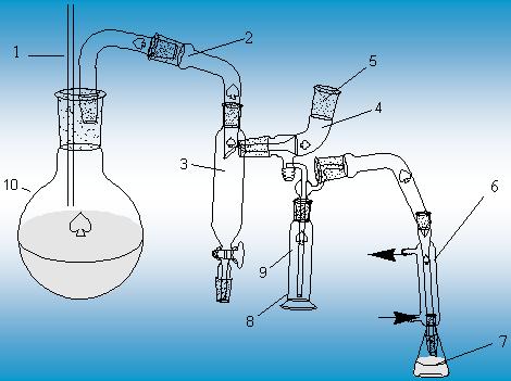 1.安全管 2.導(dǎo)管 3.汽水分離管 4.樣品入口 5.塞子6.冷凝管 7.吸收瓶 8.隔熱液套