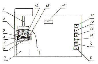 1.7 按動和面鍵(12)和洗滌鍵(11),托架(4)帶動洗滌杯(2)下降,洗滌鉤轉動,開始和面顯示器(14)后二位顯示和面的時間(S)。當和面到達所設置的時間(20S)后,托架帶動洗滌杯上升,水泵向洗滌杯內供水,開始洗滌面團,顯示器前一位顯示洗滌面團的時間(min),當洗滌到達所設置的時間(5min)后,儀器停止工作,完成洗滌。和面鍵(12)和洗滌鍵(12)也可分開使用,如和面結束后再按洗滌鍵,儀器開始洗滌。