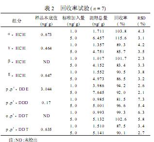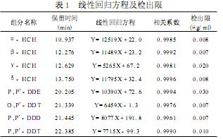 2. 1  線性范圍與檢出限 用正己烷將100μg/ ml 的儲備液分別稀釋成不同質量濃度的標準溶液進行實驗,并繪制標準曲線,試驗結果表明,被測組分質量濃度在0. 01~5. 00μg/ ml的范圍內與其色譜峰面積呈線性關系。HCH 和DDT 8 種組分的線性回歸方程、相關系數及方法檢出限(S/ N = 3) 見表1