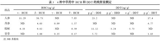 本文建立了4 種植根類中草藥中8 種有機氯農藥殘留的氣相色譜測定方法,方法操作簡便,準確度高。從測定結果看,8 種有機氯農藥殘留在這四種草藥中均有檢出。其中β- HCH 含量最高,P , P′- DDD 最低,參考2000 版藥典中對黃芪甘草項下對HCHs 和DDTs 的限量標準 ,檢測的4 種中草藥樣品有機氯殘留均未超標。