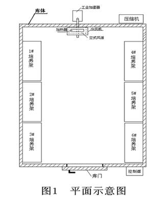 溫度系統(tǒng)由加熱器、壓縮機(jī)組、冷風(fēng)機(jī)、立式風(fēng)道、溫度傳感器和控制系統(tǒng)等組成。壓縮機(jī)組采用高效的法國美優(yōu)樂MT36(3匹)全封閉壓縮機(jī)(含進(jìn)口附配件)。冷風(fēng)機(jī)采用國產(chǎn)30m2高效低噪音冷風(fēng)機(jī)。溫度傳感器采用進(jìn)口(寧波組裝)KL型高精度熱敏電阻,具有精度高、可靠性極高。壓縮機(jī)組用支架安裝在室外,并用機(jī)罩罩住。冷風(fēng)機(jī)安裝在房門對面的頂板上,冷風(fēng)機(jī)的進(jìn)口處與位于其下的立式風(fēng)道相連接,立式風(fēng)道的進(jìn)風(fēng)出在其底部兩側(cè),如圖2所示。加熱器安裝在風(fēng)道內(nèi)。