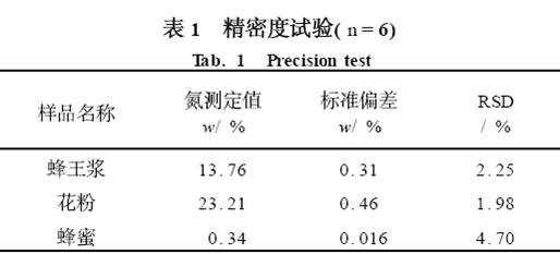 取蜂王漿、花粉、蜂蜜樣品,按試驗(yàn)方法進(jìn)行6次測(cè)定,樣品測(cè)定值的相對(duì)標(biāo)準(zhǔn)偏差(RSD) 結(jié)果見表1 。