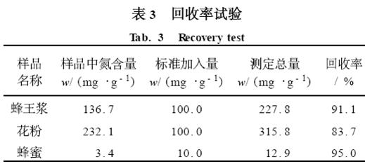 取蜂王漿、花粉、蜂密樣品,加入氨氮標(biāo)準(zhǔn)溶液,按試驗(yàn)方法進(jìn)行樣品處理與測(cè)定,回收率測(cè)定結(jié)果見表3 。
