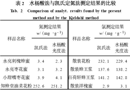通過(guò)改進(jìn)蜂產(chǎn)品蛋白質(zhì)消化的條件,有效地縮短了反應(yīng)時(shí)間,由原來(lái)的3. 5 h 縮至2 h 左右。由于水楊酸光度法樣品消化液不需要蒸餾,直接用于測(cè)定,更適宜于批量樣品的測(cè)定,水楊酸光度法與國(guó)標(biāo)法比較無(wú)顯著性差異,所以水楊酸光度法因其操作簡(jiǎn)便、準(zhǔn)確、迅速,可用于蜂產(chǎn)品中蛋白質(zhì)的測(cè)定。