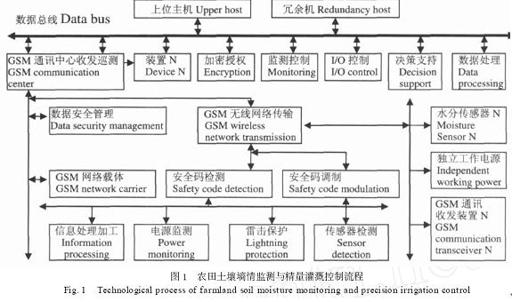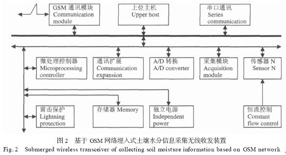 在精量灌溉系統控制硬件開發過程中,系統可控的范圍大,硬件的通用性、標準性和可擴展性是關鍵。研究開發先進的無線通訊收發裝置為大范圍區域灌溉群控提供了硬件基礎。由于灌溉區域遼闊,在中央控制室設有無線巡測中心通訊收發裝置,完成現場眾多土壤采集動態數據的空間傳輸 。整個硬件系統不僅做到無線網絡載體下的信息處理加工、安全信息管理,且系統各部分控制相對獨立。控制參數修改無線與在線便攜化,無太多的管線需要敷設和維護,系統具有一定程度上的容錯性能,局部的損壞不會影響整個系統的工作。