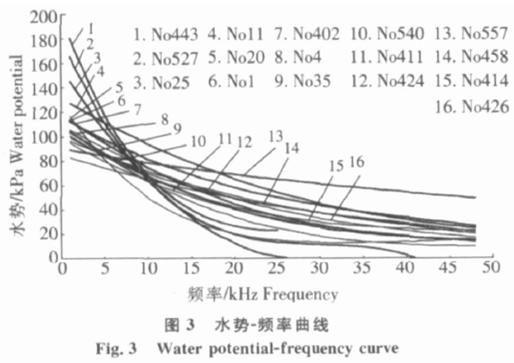 利用在山東禹城試驗站和河南封丘試驗站進行的土壤水分傳感器適應性分析得出以下分析數據:假設傳感器測量頻率的量程為0~50 kHz。在該量程范圍內,依據土壤水分傳感器的標定曲線,繪制各個傳感器的水勢2頻率曲線,按率定公式計算的水勢隨頻率的增加而增大(圖3) 。