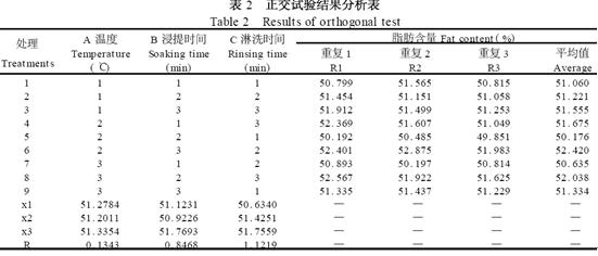 1. 6 數(shù)據(jù)分析 粗脂肪含量( %) = (W2 - W1 ) ×100/ W0 ,正交試驗結(jié)果的統(tǒng)計分析參考明道緒主編的有重復(fù)觀測值正交試驗結(jié)果,用新復(fù)極差法進行多重比較,在DPS 7. 05上完成。