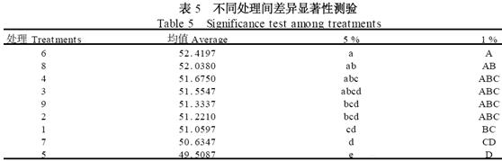 (0. 8468) > RA (0. 1343) ,即淋洗時間對測定結(jié)果影響最大,其次是浸提時間,浸提溫度的影響最小。方差分析結(jié)果表明(表3) ,因素B (浸提時間) 和因素C(淋洗時間) 各水平間差異顯著, 因素A(浸提溫度) 各水平間差異不顯著。由于因子A 不同水平間差異不顯著,結(jié)合B、C 因素各水平間的平均數(shù)和顯著性測驗結(jié)果(表4) ,B3C3 和B3C2 應(yīng)為較好的提取方案。它們相對應(yīng)于處理3 (A1B2 C3 )和處理6 (A2B3 C2 ) ,在9 個處理中分別位于第四位和第一位(表5) 。綜上所述,A2B3 C2 應(yīng)為最優(yōu)組合,即浸提溫度120 ℃、浸提時間80 min、淋洗時間30 min 為花生粗脂肪的最佳提取方案。