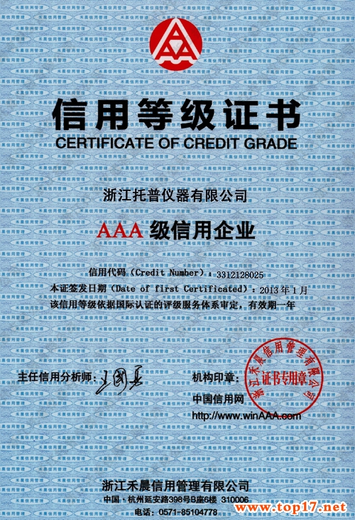 熱烈祝賀浙江托普儀器有限公司在2013年1月獲得AAA級信用企業稱號。