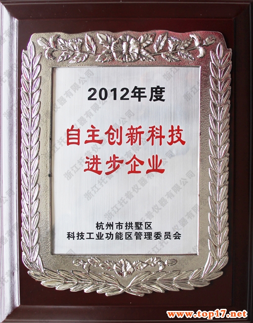 根據杭州市拱墅區科技工業功能區管委會研究決定,為了進一步引導企業自主創新,走新型工業化道路,加快發展高薪技術產業,不斷優化產品結構,特授予托普儀器“自主創新科技進步企業”榮譽稱號