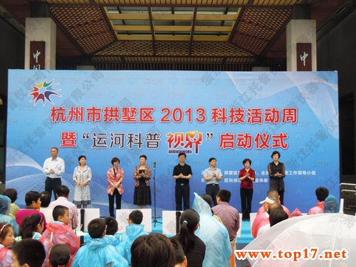 2013年5月17日上午,拱墅區(qū)2013年科技活動周暨“運河科普視界”活動啟動儀式在小河路中國杭州刀剪劍博物館廣場隆重舉行。此次科技活動周主題為“科技推動創(chuàng)新 建設(shè)幸福拱墅”。杭州市科協(xié)主席鄔麗娜、杭州市科委副巡視員徐植、浙江省科協(xié)科普部副部長姜曉東、拱墅區(qū)四套班子領(lǐng)導(dǎo)、市科委、市科協(xié)、浙大城市學(xué)院、浙江樹人大學(xué)等領(lǐng)導(dǎo)應(yīng)邀出席開幕式。區(qū)各相關(guān)機關(guān)單位、職能部門、街道科協(xié)、區(qū)屬學(xué)(協(xié))會、轄區(qū)高校、高新技術(shù)企業(yè)代表、社區(qū)居民等500多人參加開幕式,共同啟動了2013年拱墅區(qū)科技活動周暨“運河科普視界”活動。