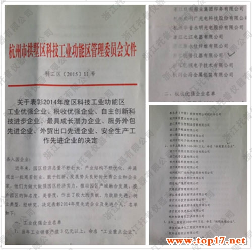 托普儀器被評定為拱墅區“工業先進企業”、“納稅重點企業”
