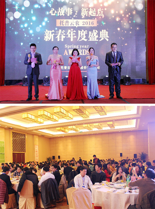 羊隨新風辭舊歲,金猴獻瑞迎新春。2016年1月30日,“新起點   新起航——托普云農2015年度總結表彰大會暨2016迎新春聯歡會”在杭州海外海·納川大酒店隆重舉行。300余名托普家人共聚一堂,回顧這一年所取得的成績,規劃2016年新的奮斗目標,共同迎接歡樂幸福的農歷新年。