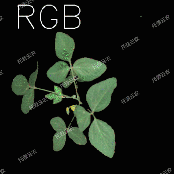 可見光二維成像單元:獲取植株側視可見光圖像,并利用人工智能算法分析獲取株高、葉頂點數、投影面積等形態參數,黃色投影面積、綠色投影面積等顏色參數,以及平滑度等紋理參數,用于植株株型與健康狀態相關表型分析。