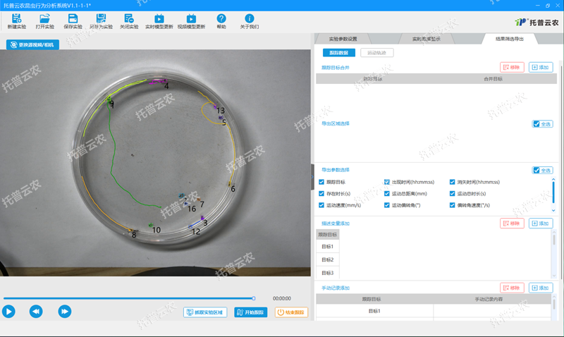 托普TP-KCXW昆蟲行為分析系統是由昆蟲行為分析系統軟件、專用筆記本電腦、高清高幀工業相機組成。使用專用軟件對錄制的昆蟲活動視頻或傳入實時昆蟲觀測視頻流進行分析,識別并跟蹤目標昆蟲,獲取昆蟲隨時間變化的(X,Y)坐標,同時記錄輸出十余種昆蟲運動相關參數,記錄運動軌跡圖,實現昆蟲運動可視化分析,輔助昆蟲行為研究。