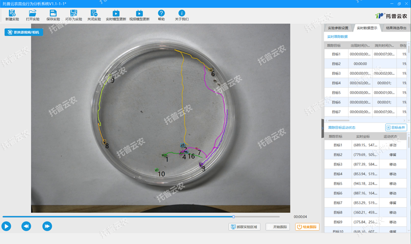 托普TP-KCXW昆蟲行為分析系統使用專用軟件對錄制的昆蟲活動視頻或傳入實時昆蟲觀測視頻流進行分析,識別并跟蹤目標昆蟲,獲取昆蟲隨時間變化的(X,Y)坐標,同時記錄輸出十余種昆蟲運動相關參數,記錄運動軌跡圖,實現昆蟲運動可視化分析,輔助昆蟲行為研究。