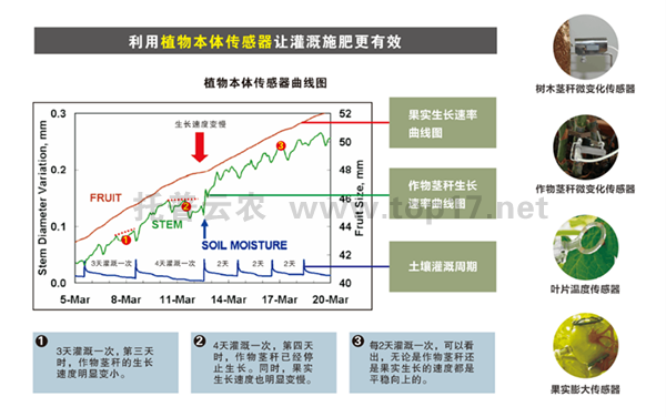 植物本體傳感器,能實(shí)時(shí)或階段性地監(jiān)測(cè)植物莖稈粗細(xì)的變化、葉面的溫度、莖流速率、果實(shí)增重與膨大速率、植物的光合作用等植物本身的一些參數(shù),能直觀地反應(yīng)植物的生長(zhǎng)狀態(tài)。通過對(duì)作物參數(shù)的測(cè)量可直觀反映土壤或空氣環(huán)境參數(shù)對(duì)作物的影響,從而指導(dǎo)用戶更加科學(xué)合理地調(diào)控生產(chǎn)環(huán)境,以達(dá)到作物高產(chǎn)優(yōu)質(zhì)。