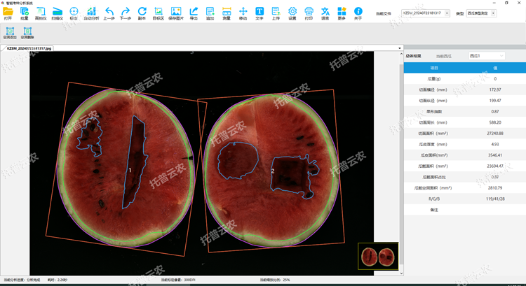8.瓜果表型分析:用于測量西瓜切面的瓜瓤、瓜皮等果形指標(biāo),可自動分析切面橫徑、切面縱徑、果形指數(shù)、切面周長、切面面積、瓜皮厚度、瓜皮面積、瓜瓤面積、瓜瓤空洞面積、顏色以及瓜重等果形參數(shù),軟件支持圓形水果表型測定,也可支持定制其它園藝作物果實切面表型指標(biāo)。常用于西瓜果實育種、西瓜關(guān)鍵基因定位、逆境脅迫、西瓜表型指標(biāo)測定等領(lǐng)域。