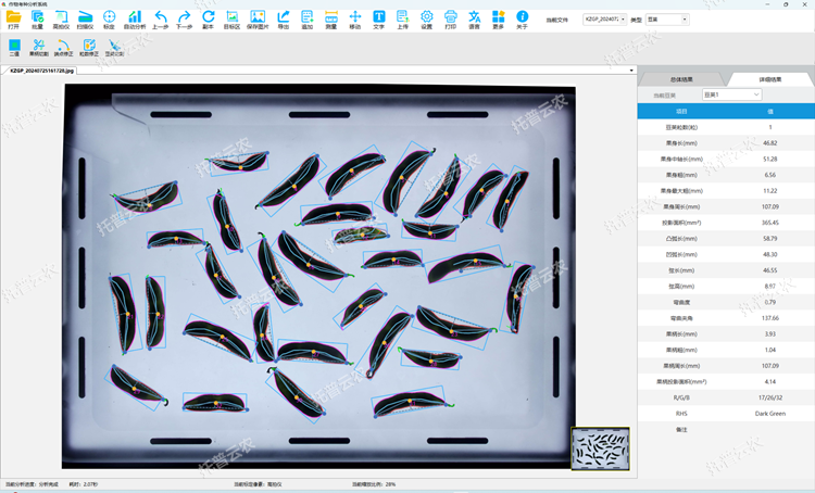 6.粒型指標(biāo)分析:可用于≥30種水稻、小麥、玉米、大豆、高粱、谷子、油菜,蔬菜、花卉等同粒型種子的粒型指標(biāo)分析,可對每一粒籽粒分析計算,分析種子的詳細(xì)結(jié)果:自動檢測單粒種子的粒型參數(shù)(長、寬、長寬比、面積、周長)。也可分析各類種子總結(jié)果:所有種子的總粒數(shù)、千粒重/百粒重、粒色、平均值(長、寬、長寬比、面積、周長)、標(biāo)準(zhǔn)差,半自動檢測容重、水分,并可并輸出種子大小排列對比圖
