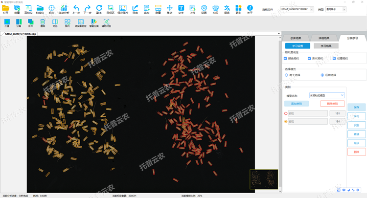 14.智能對比:能精準(zhǔn)顯示種粒外接矩形,對不同品種的種子進(jìn)行長和寬的對比,并輸出排列、對比圖。深度學(xué)習(xí):根據(jù)顏色或是形狀的不同對種子進(jìn)行自學(xué)習(xí)和再學(xué)習(xí),并實現(xiàn)自動分類識別。
