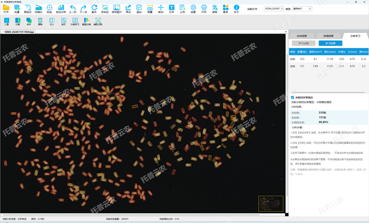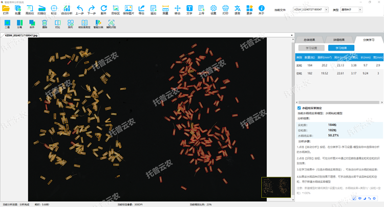 2.水稻結(jié)實率分析:能精準(zhǔn)顯示種粒外接矩形,得出空粒數(shù),實粒數(shù),結(jié)實率百分比數(shù)據(jù),并可直接標(biāo)記空粒、實粒,顯示各籽粒粒型數(shù)據(jù)(長、寬、長寬比、面積、周長),可預(yù)設(shè)水稻粳粒結(jié)實率模型和水稻秈粒結(jié)實率模型,并支持根據(jù)自己的品種重新學(xué)習(xí)建模。
