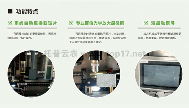 主要用于監(jiān)測病害孢子存量及其擴(kuò)散動態(tài),實(shí)現(xiàn)全天候無人值守,實(shí)時(shí)采集分析監(jiān)測孢子情況。儀器內(nèi)置高倍光學(xué)顯微成像系統(tǒng),可定時(shí)清晰拍攝孢子圖片,遠(yuǎn)程自動上傳至管理平臺,為預(yù)測和預(yù)防病害流行、傳染提供可靠數(shù)據(jù)。儀器可固定在測報(bào)區(qū)域內(nèi),定點(diǎn)觀察特定區(qū)域孢子種類及數(shù)量。